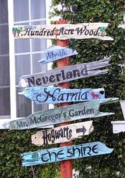 Remekül feldobja a kertünket egy ilyen útjelző tábla. Milyen messze is lehet Narnia? Apa munkahelye? Nagyiék?